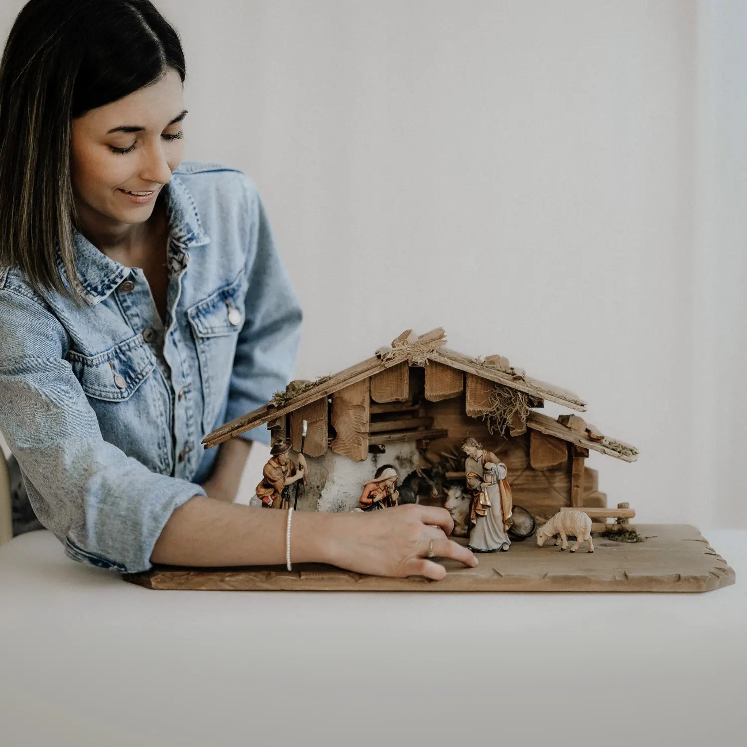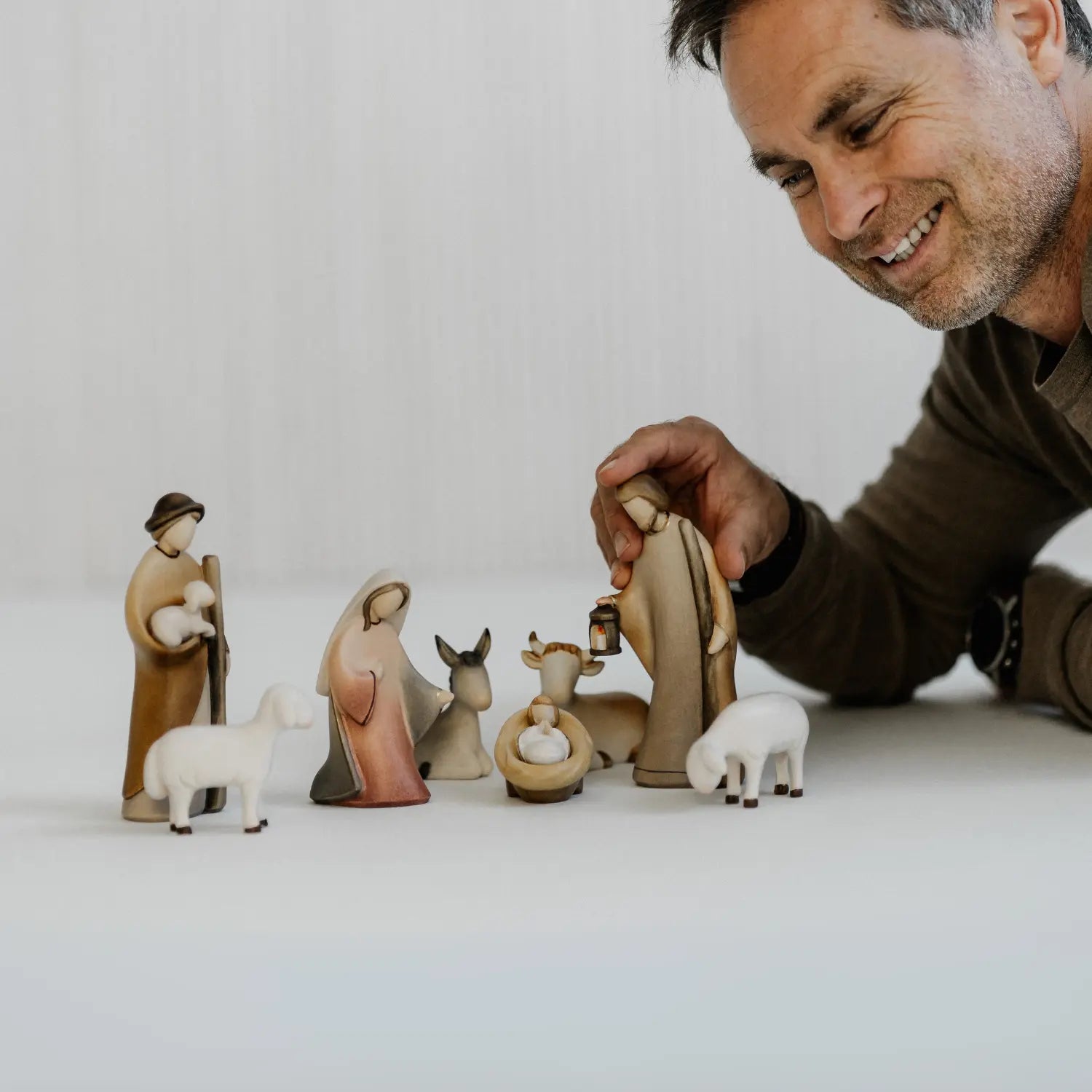 Das 7er Set der Kostner Krippe besteht aus den drei wichtigsten Krippenfiguren der traditionellen Weihnachtskrippe: der Hl. Maria, dem Hl. Josef und dem Jesuskind. Das Set beinhaltet außerdem den Ochsen, den Esel, den Schäfer und das Schaf stehend rechtsschauend. Diese Figuren wurde mit Sorgfalt und Liebe zum Detail entworfen und aus edlem und hochwertigen Bergahornholz geschnitzt. Die Bemalung des gesamten Sets erfolgt nach traditionellem Vorbild und gilt somit als ein handwerkliches Unikat mit höchster Qualität.